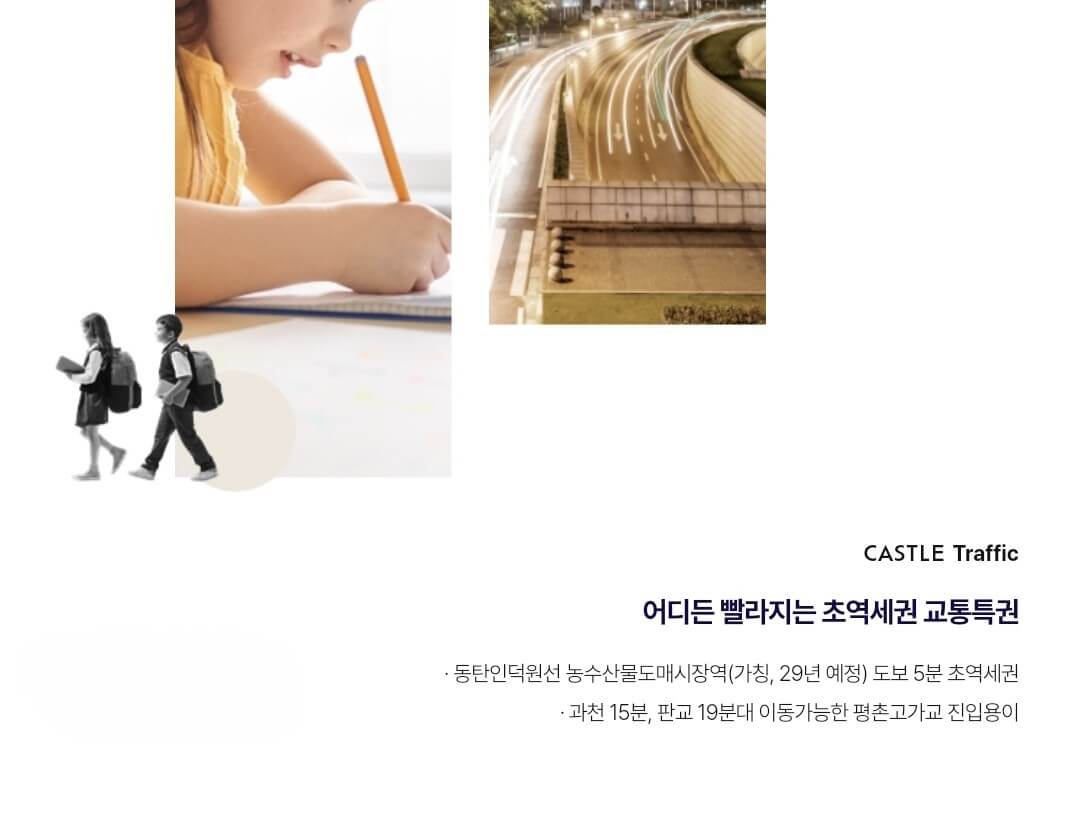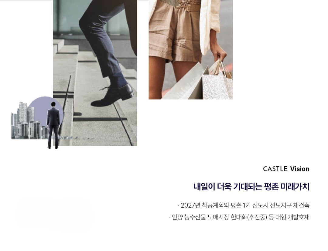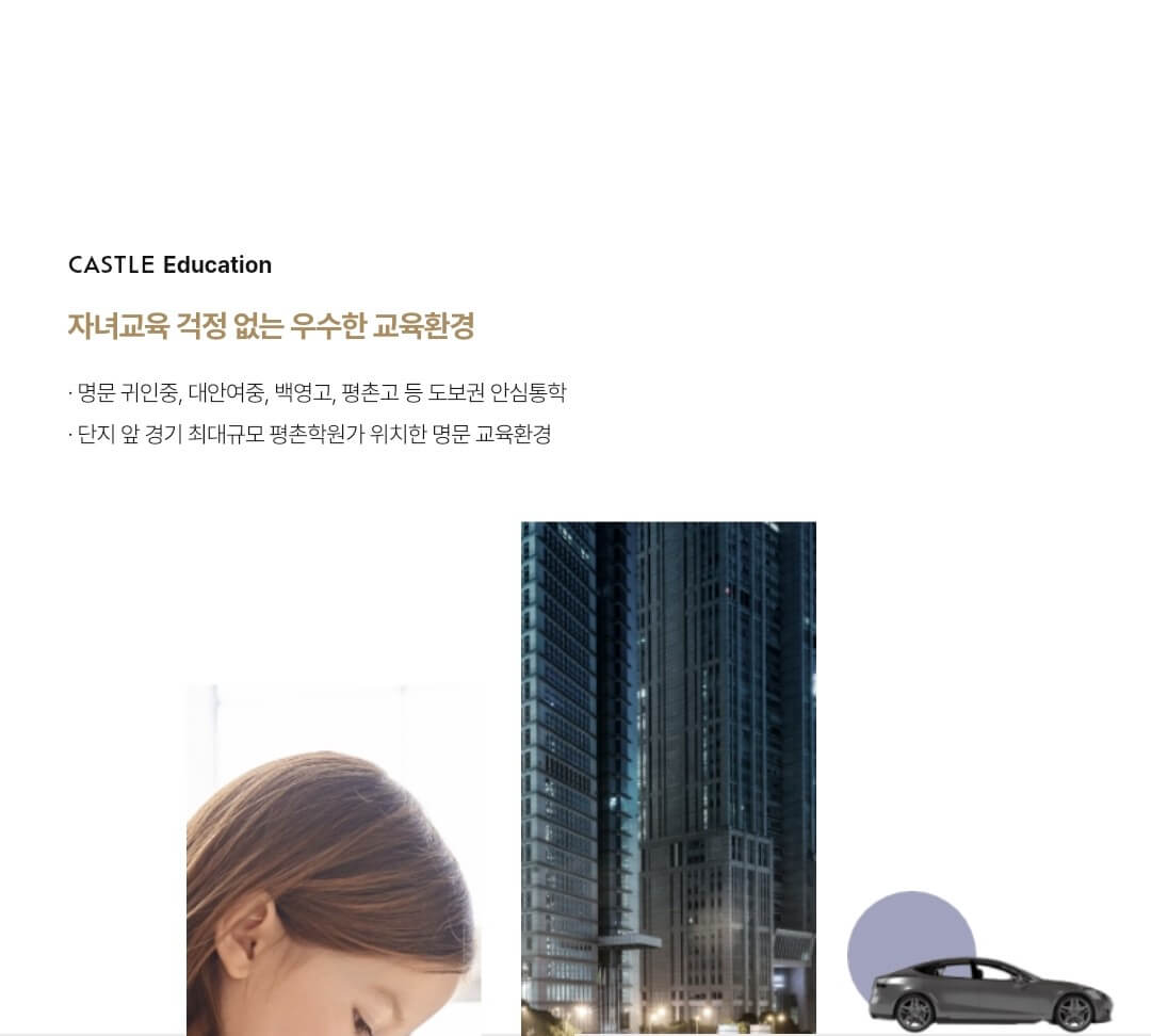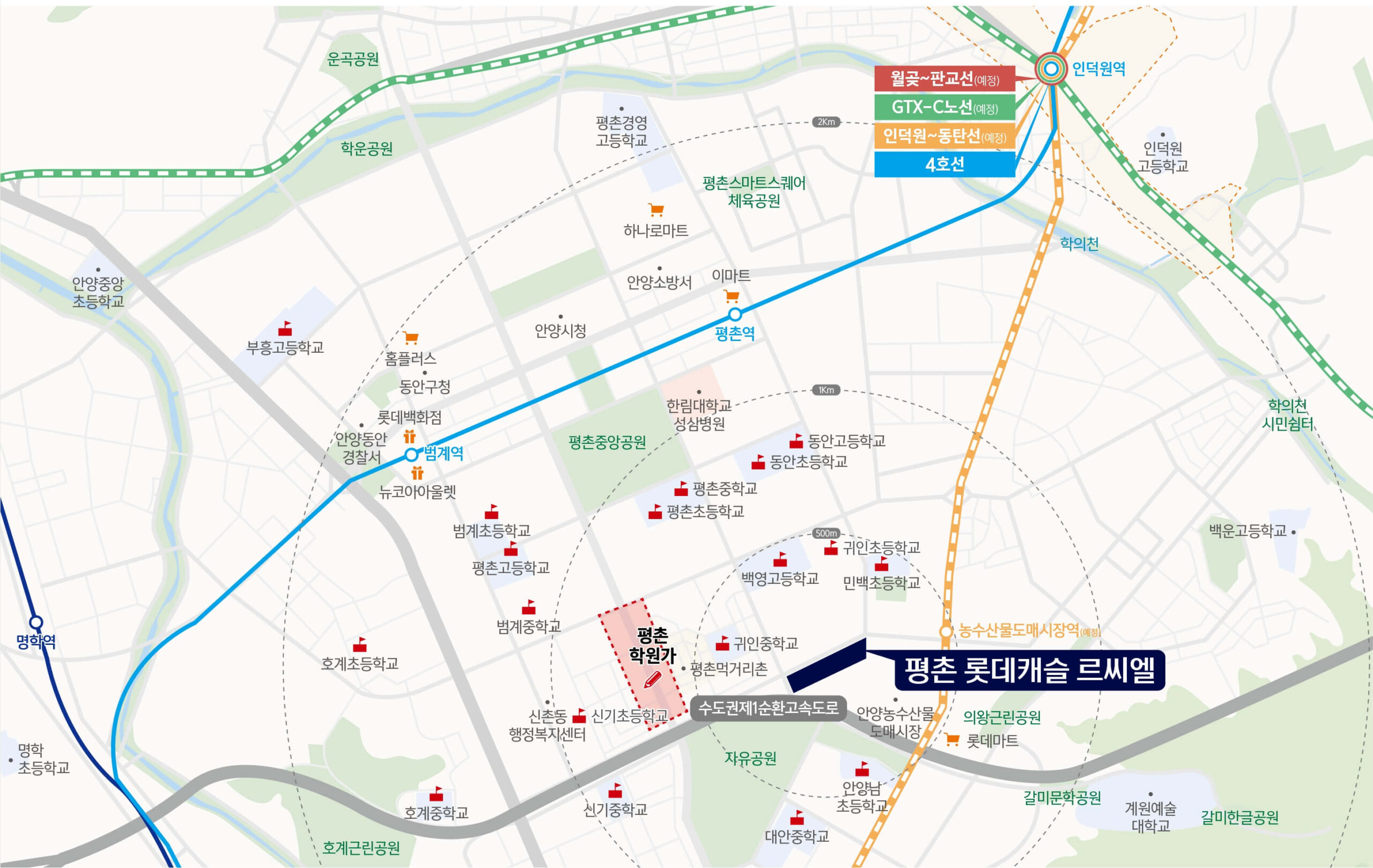 평촌을 둘러싼 명문학군 및 전국적으로 알려진 평촌학원가를 품고있어 교육여건이 우수하며, 평촌 신도시 핵심 입지에 지하철 4호선 범계역과 평촌역을 이용할 수 있습니다. GTX-C(예정)와 동탄~인덕원 복선전철(예정)도 예정돼 있습니다.