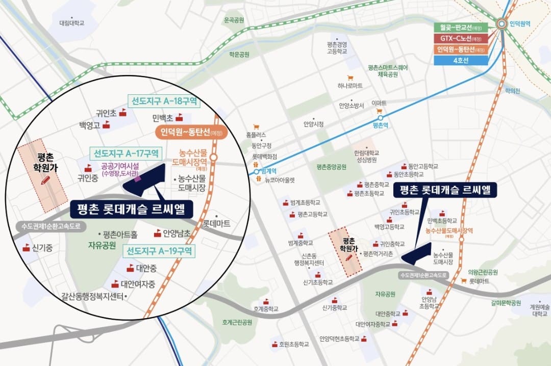 4호선 평촌역과 수도권 제1순환고속도로, 제2경인고속도로 등 광역교통망을 통해 서울 강남 및 과천 등 수도권 접근성이 좋습니다. 특히 단지 가까이 위치한 인덕원역이 GTX-C 노선 계획에 포함되었으며, 안양 과천을 거쳐 판교까지 잇는 월곶~판교 복선전철(월판선)도 공사 중입니다. 또한 인동선도 2027년 개통을 앞두고 있습니다.